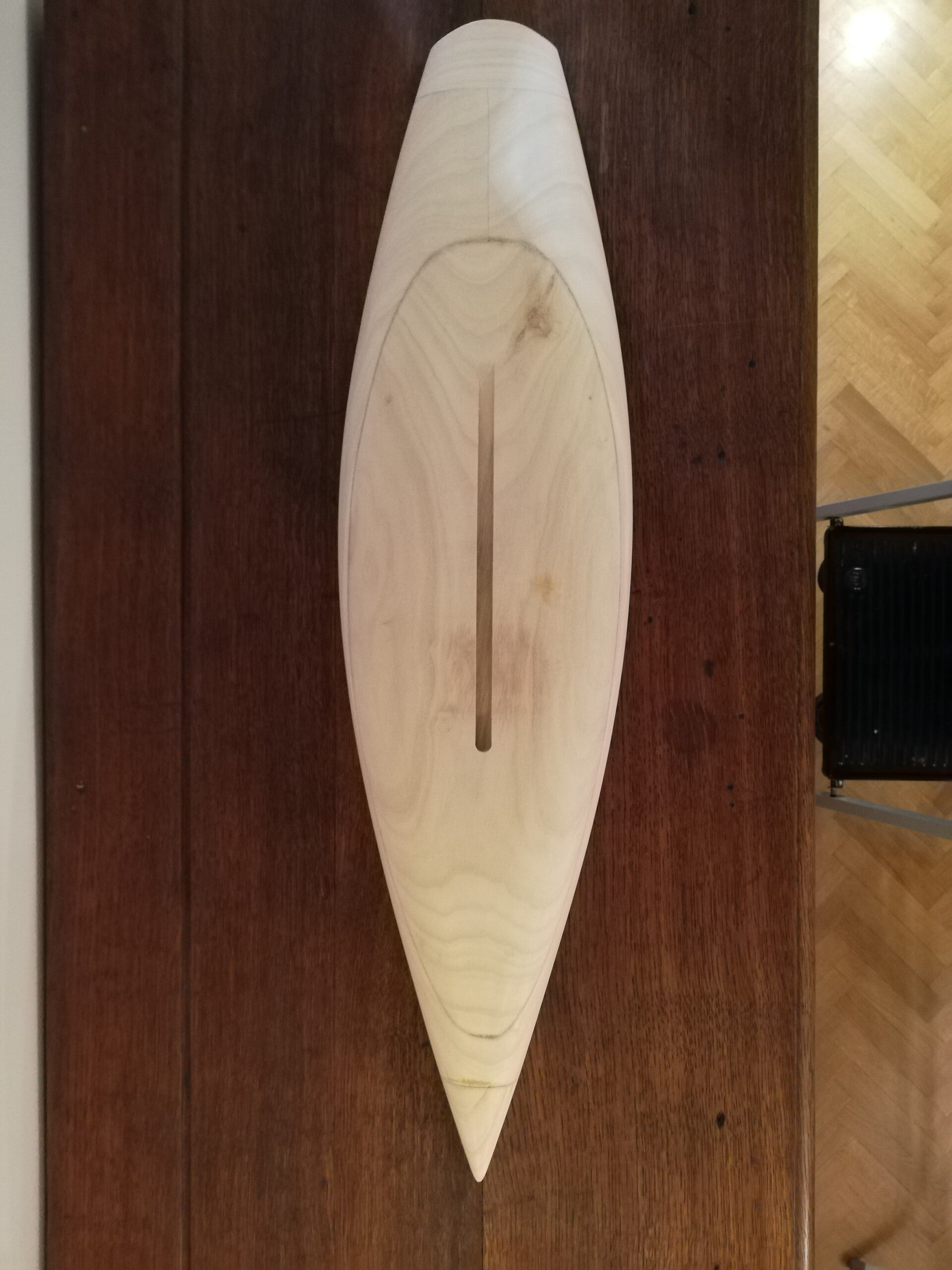 Coque sculptée, pontée en paulownia vernis, pavois acajou